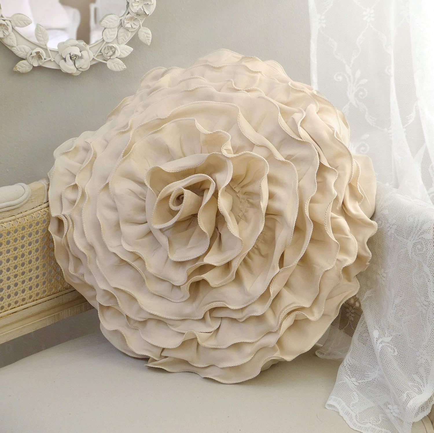 Affascinante cuscino rotondo a volant beige con inserto perfettamente montato in morbido cotone con lato posteriore in lino con busta più vicina, aggiungerà alla vostra casa romantico shabby chic cottage e atmosfera country francese cuscini rotondi. Cuscini questa categoria contiene un solo prodotto.